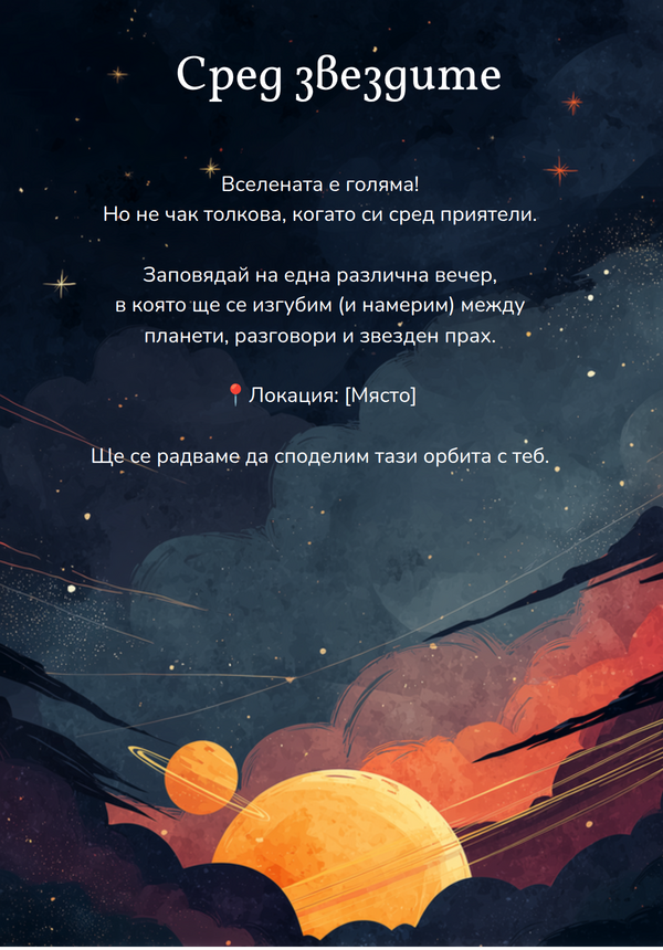 Стилни и разнообразни покани за всички важни събития в живота на възрастните – от рождените дни и юбилеите до сватбите и парти изненадите. Персонализирай лесно и направи празника си незабравим.